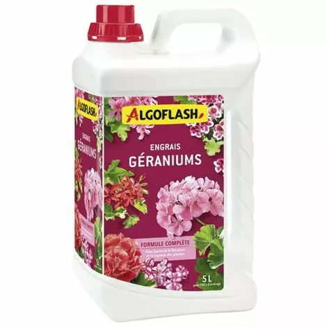 Engrais géraniums 5l /nc de la marque ALGOFLASH. Engrais complet et équilibré. Favorise la floraison et intensifie la couleur. Avec oligoéléments. Bouchon doseur. 90% recyclé et 100% recyclable. Convient à tous les géraniums.