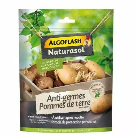 L’anti-germes LIMITE la germination des pommes de terre durant leur stockage pour permettre une plus longue conservation. Formulation à base d’un principe actif d’origine naturelle : l’huile de menthe verte, permet de protéger jusqu’à 36 kg de pommes de terre. Sachet diffuseur à disposer à l’intérieur du tas après la récolte. Un sachet permet de protéger jusqu’à 6 kg de pommes de terre pendant 2 mois. La diffusion de la vapeur d’huile de menthe va agir directement sur la division cellulaire des germes et ainsi limiter leur développement.